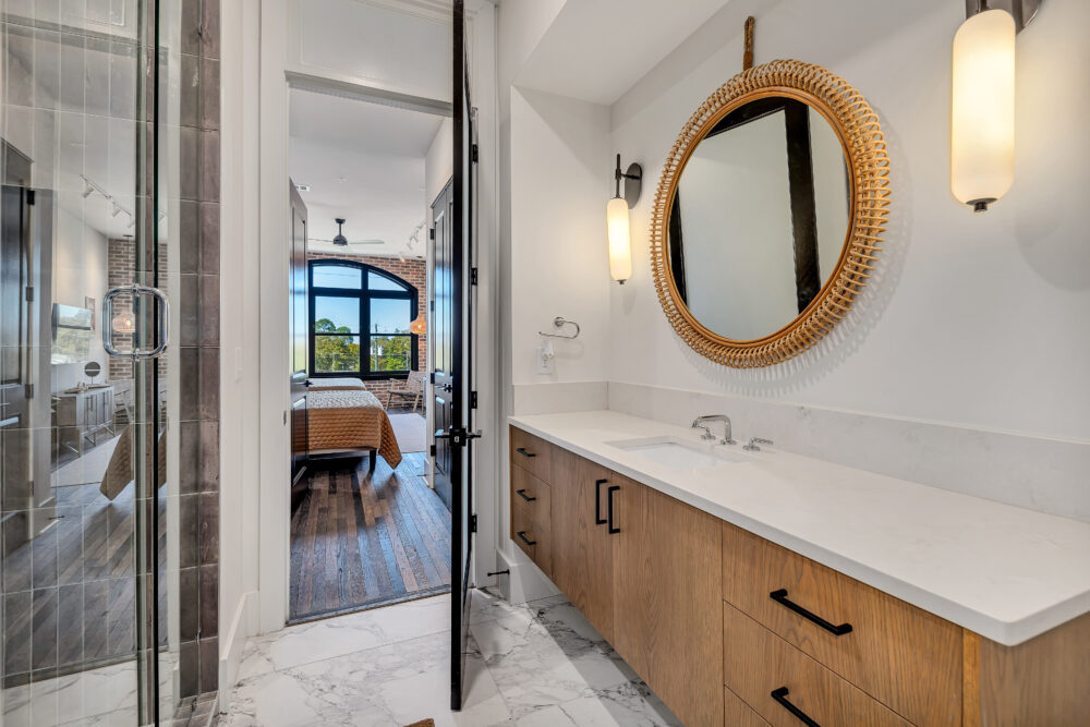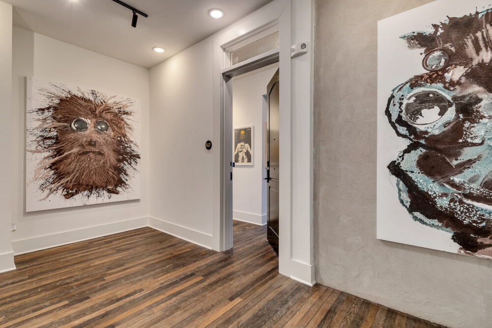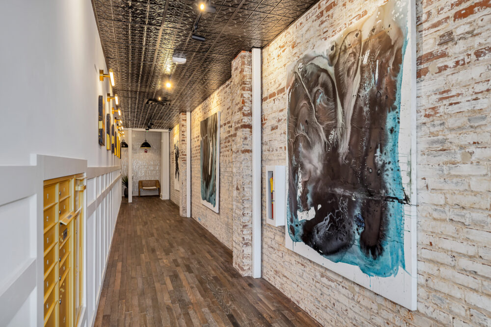 The Otis is more than just another Atlanta building. Located in the neighborhoods main entertainment corridor, It’s a new living space that offers a mix of history and modern style, all thanks to the special touch of one of the community’s former residents — designer turned television star Ty Pennington. Pennington, an ATL native and graduate of Atlanta College of Art, is best known for his work on the original Trading Spaces and ABC’s Extreme Makeover: Home Edition. Almost every piece of artwork in The Otis – not only in the spaces but also inside the gallery (which is the common areas) – is custom work by Ty Pennington. The Otis is named for an elevator manufacturer that once operated on the site. The preserved façade still carries the company’s logo.