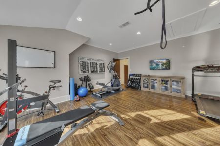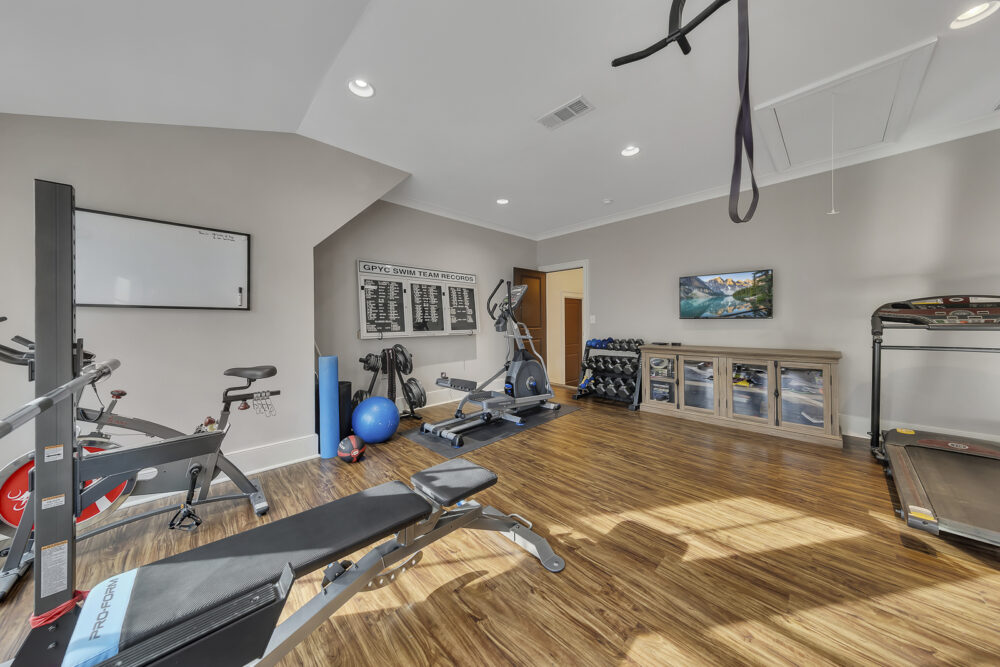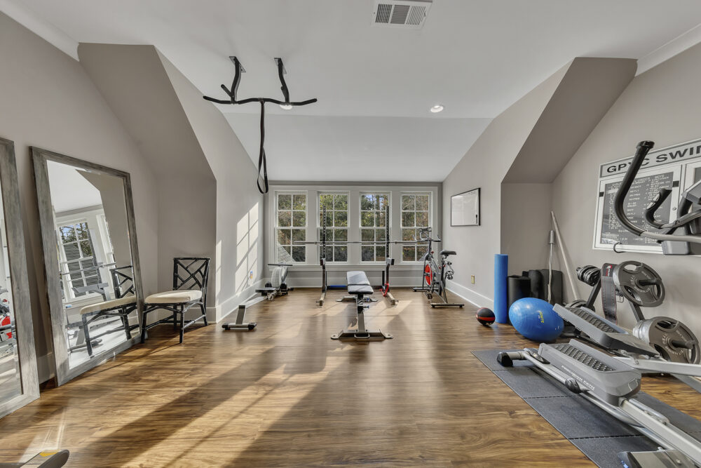Fitness room with free weights, elliptical, pull-up bar, and stationary bike