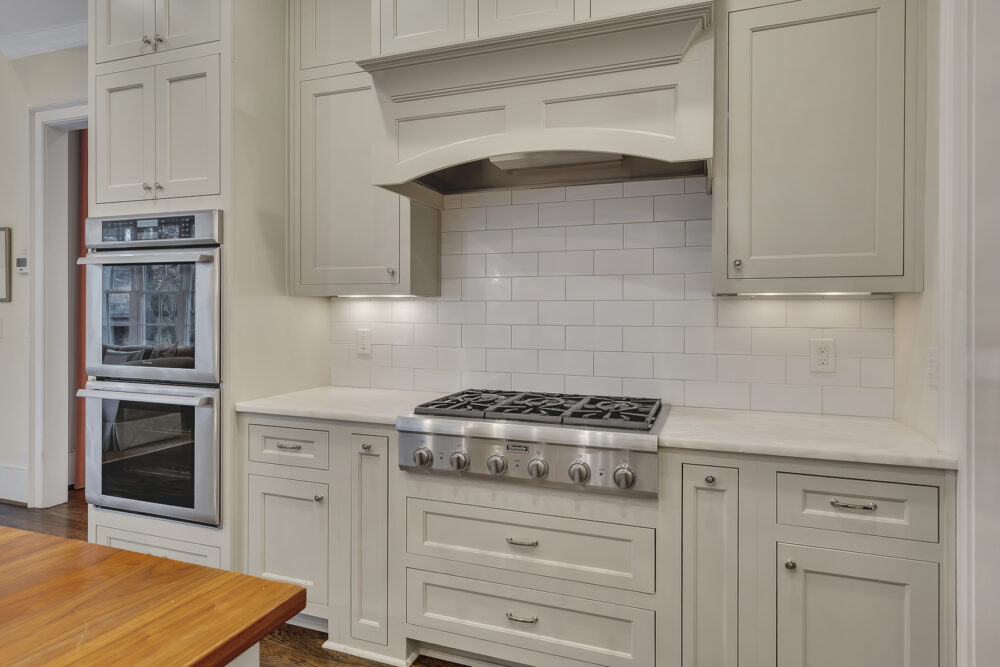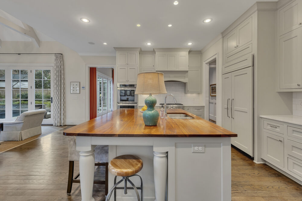 Fully equipped chef’s kitchen with Wolf appliances, oversized island, breakfast nook & wine fridge