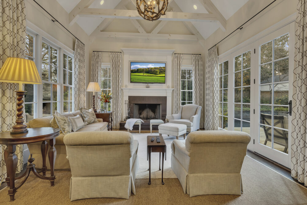 Sunroom overlooking pool with fireplace for year-round enjoyment