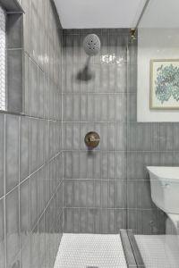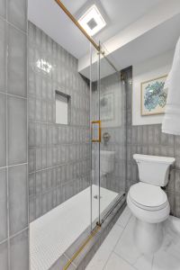 Sparkling bathroom with a walk-in shower and a spacious vanity.