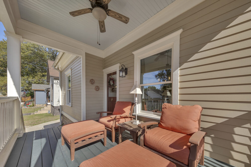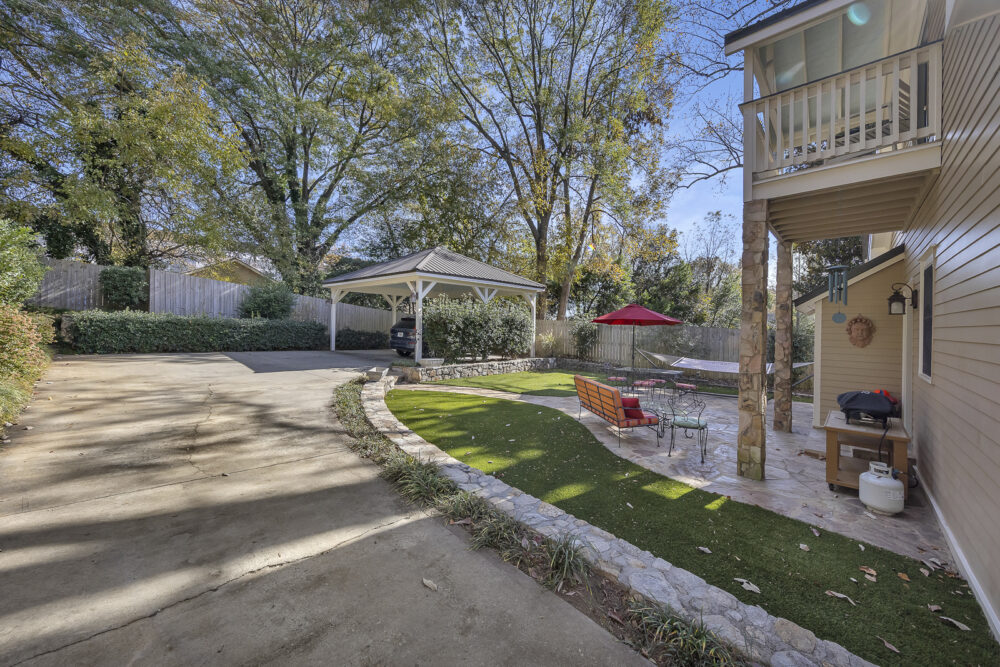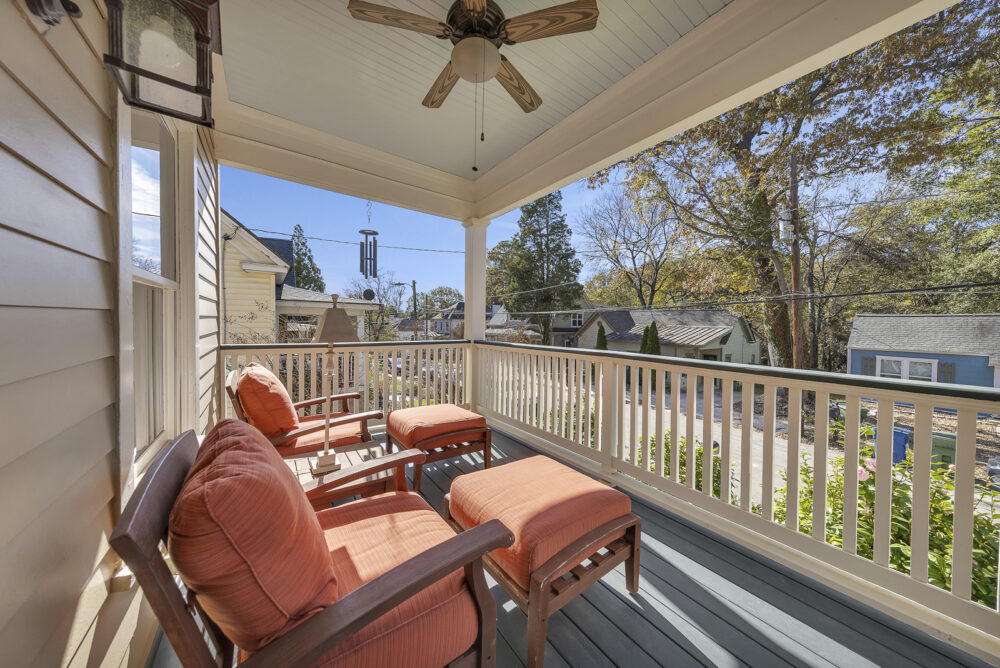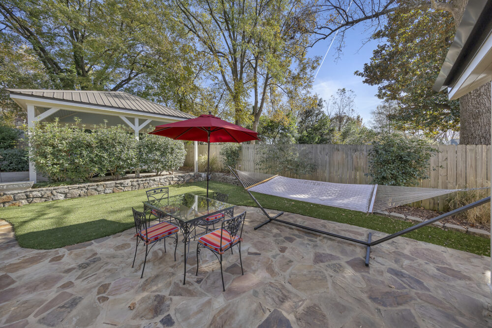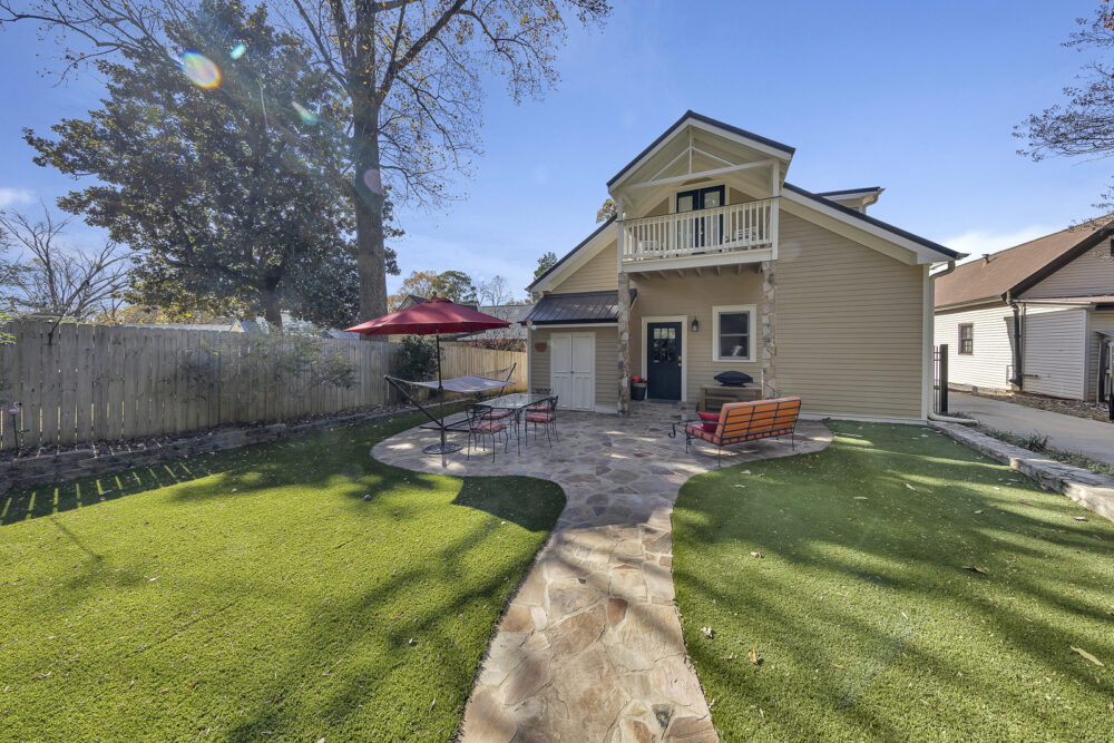 This lovely, fully furnished 3 Bedroom/3 Bath, 2,600 sq. ft. craftsman bungalow home is nestled in the West Midtown, Historic Howell Station neighborhood. The home blends Southern charm with European style. Inside, the open-concept main level is bathed in natural sunlight and features warm hardwood floors, a spacious living area with a ceiling fan and fireplace, a modern kitchen, and a new washer and dryer. Great character, 10’ ceilings with an 18’ cathedral ceiling in the living area. The home includes 4 beds plus a futon and sleeps 7 adults comfortably. The upper-level loft is an upscale master suite including, 700 sq. ft. of living area; a sitting area at the landing, sitting area with coffee table and desk, sleeping area, queen size bed plus a very comfy fold out bed, French doors leading to the bedroom, and French doors leading to a balcony with comfy seating overlooking the lovely back yard patio. The front porch provides comfortable seating for relaxation, along with a ceiling fan and lamp. The back patio provides privacy, including a hammock, sofa, coffee table, and dining room table. Off-street parking with a 2-car carport.