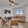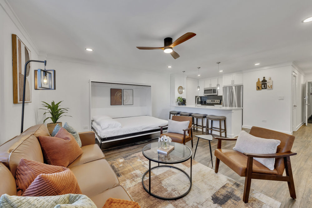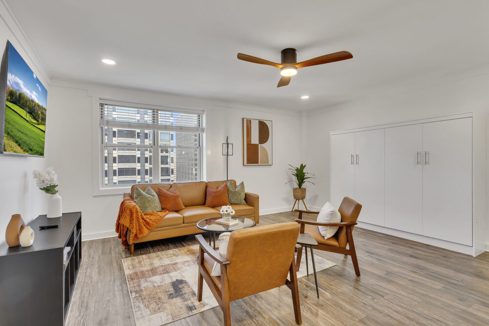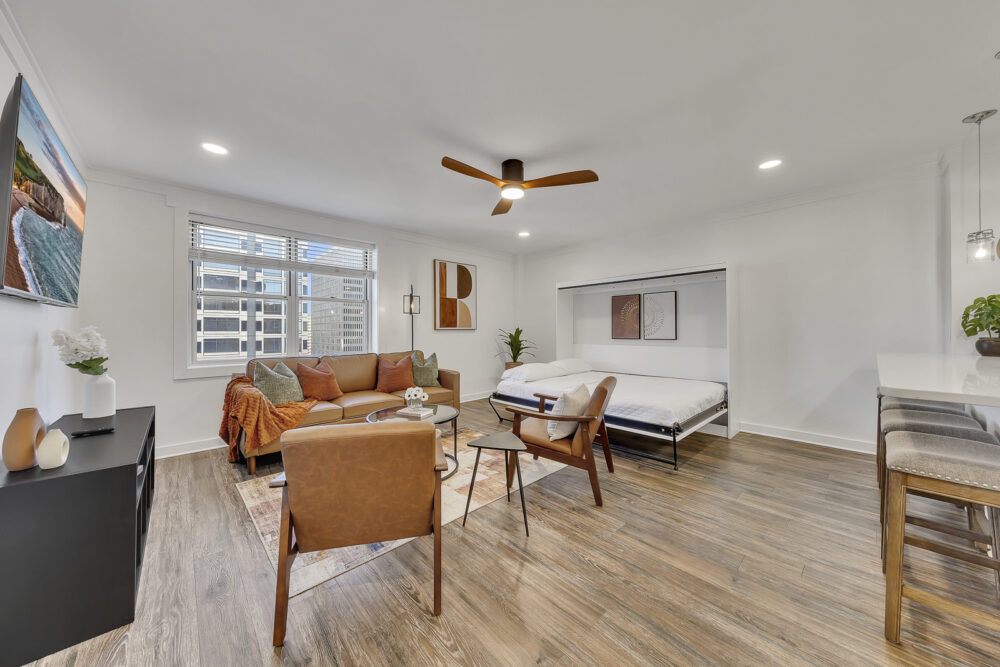 Living Room: Mid-century furnishings, skyline views, smart TV, queen sleeper sofa