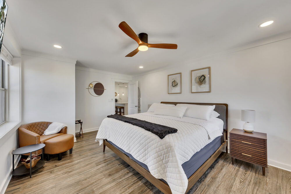 King Bedroom: Hotel-quality linens, blackout curtains, smart TV