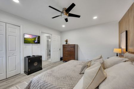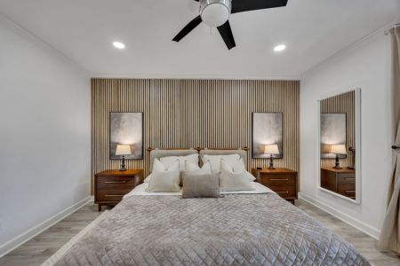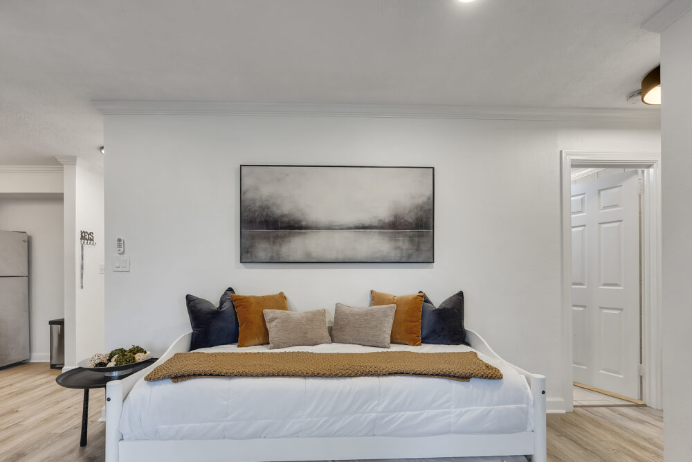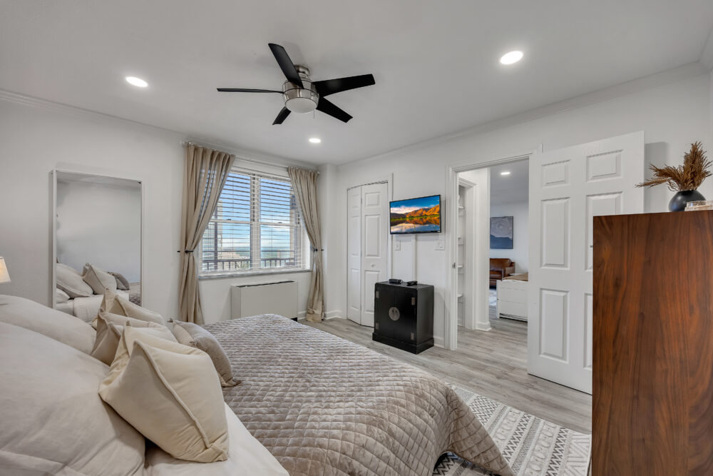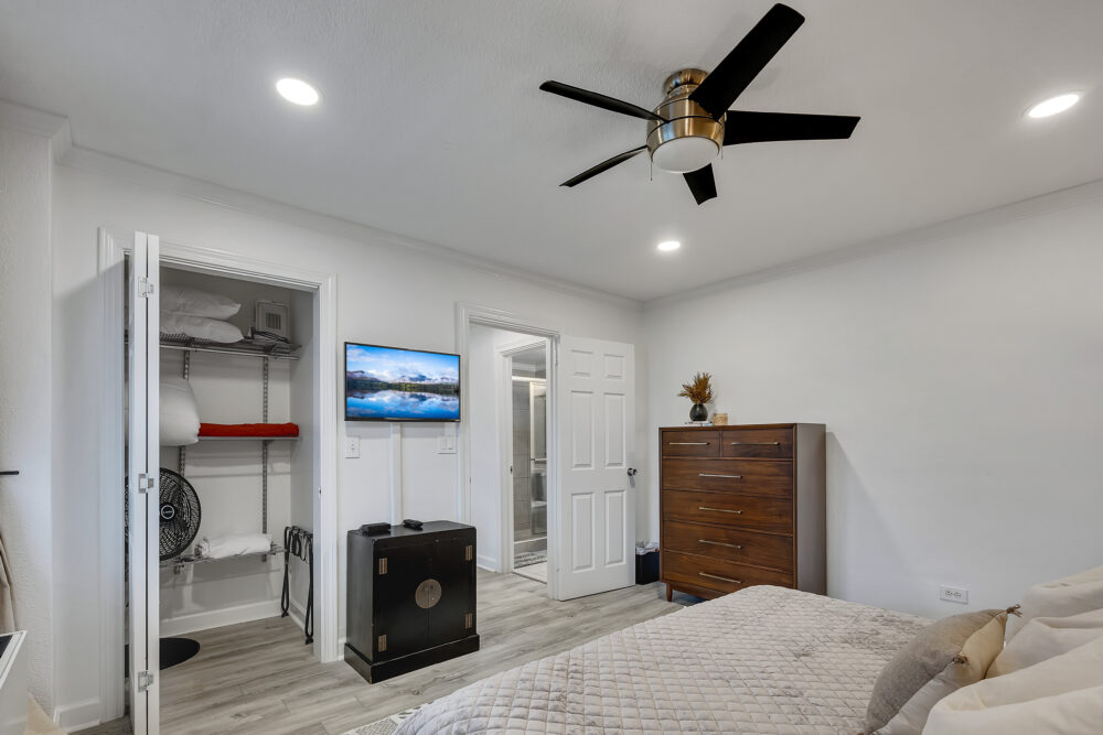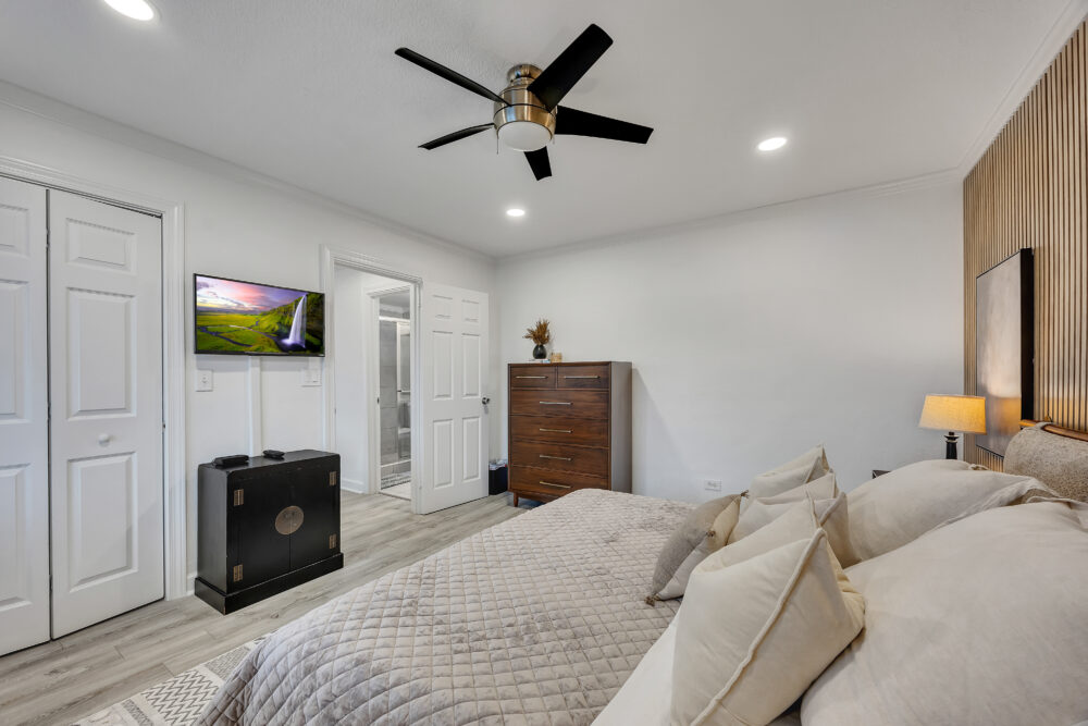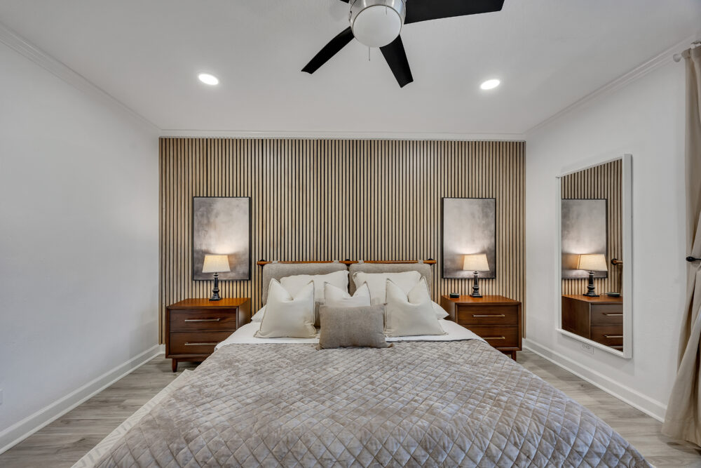 Every detail has been carefully considered—from nightstands with built-in outlets for easy charging to a clean, modern aesthetic that makes this space as functional as it is beautiful.