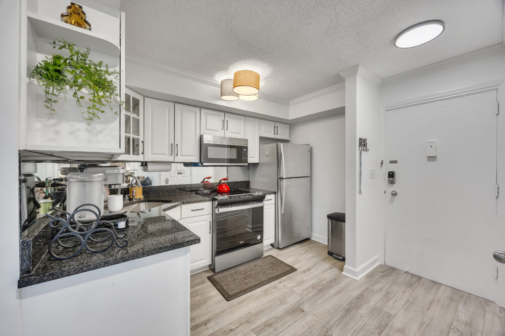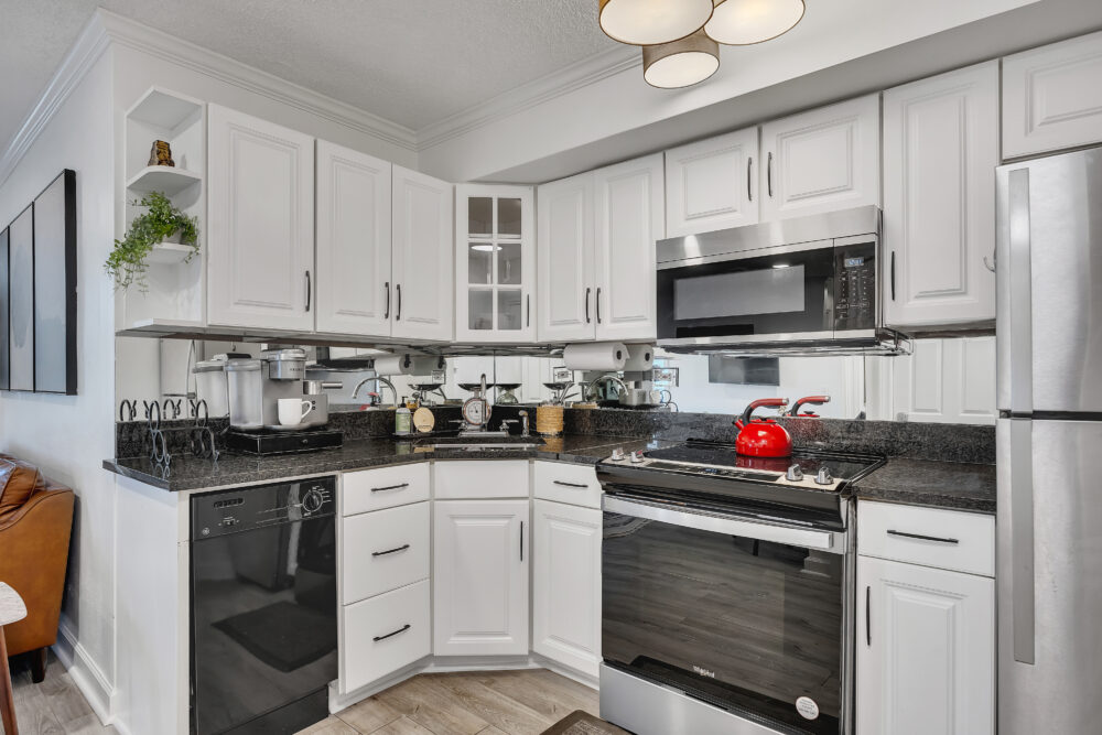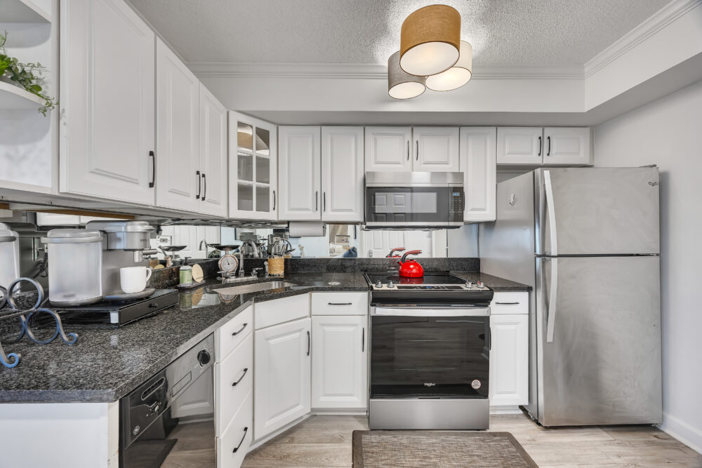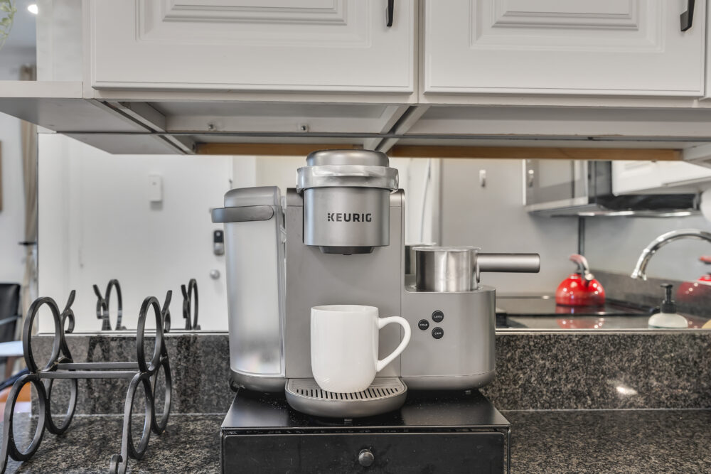 Fully equipped kitchen with granite countertops, stainless steel appliances, and a Keurig coffee station
