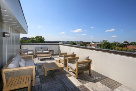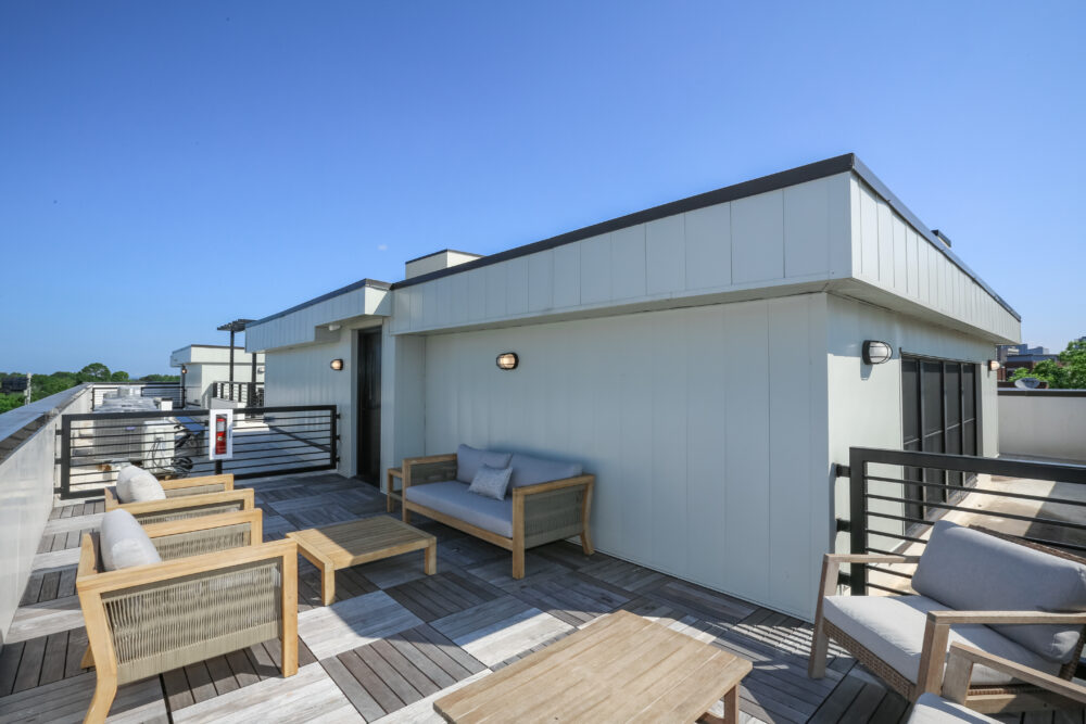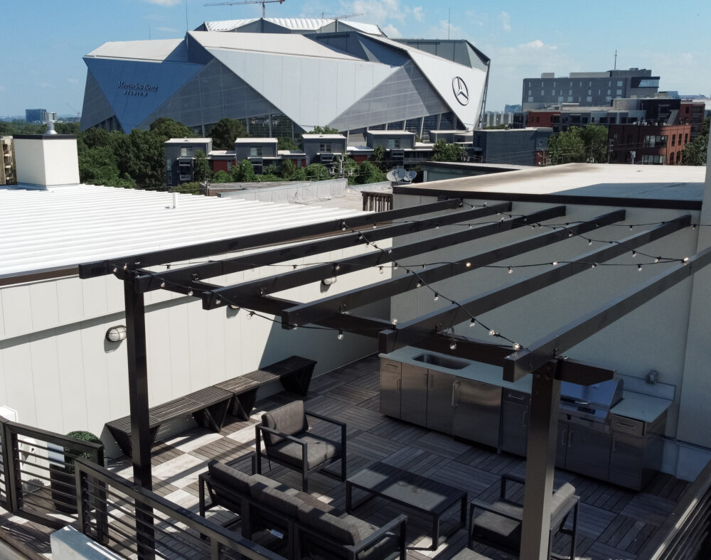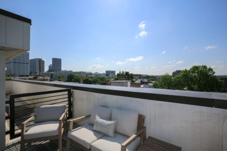 Lofted mezzanine lounge leading to a private rooftop patio with panoramic Atlanta skyline views