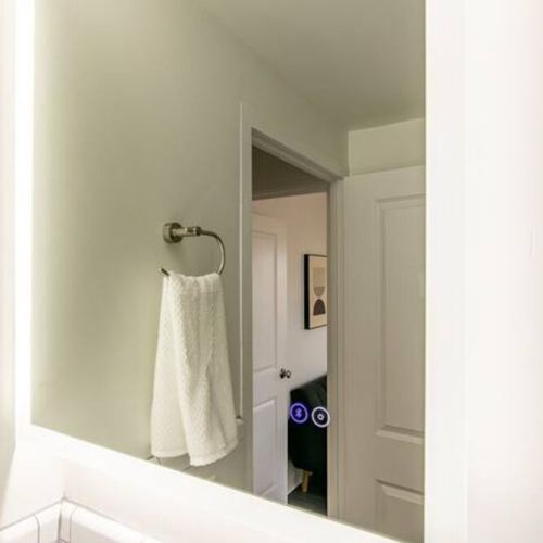 When you arrive, the foyer lights greet you automatically. Unwind in the sparkling bathroom with its walk-in shower and Bluetooth vanity—perfect for playing music as you get ready. Cook in the fully equipped kitchen with high-end finishes, or simply relax in the open-concept living area.
