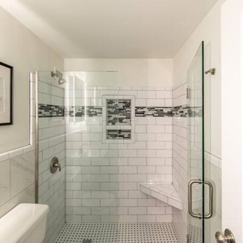 Sparkling walk-in frameless shower with Bluetooth vanity