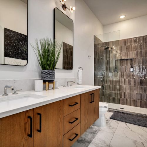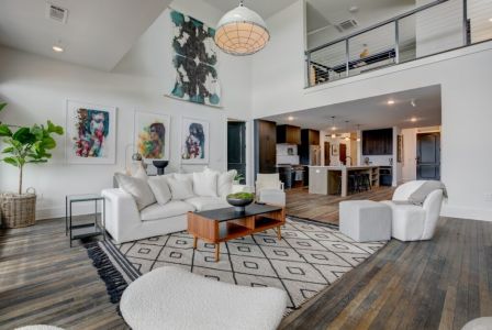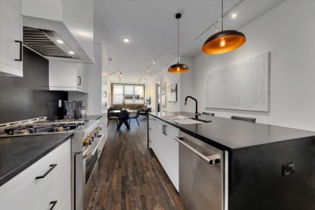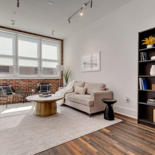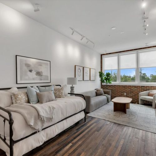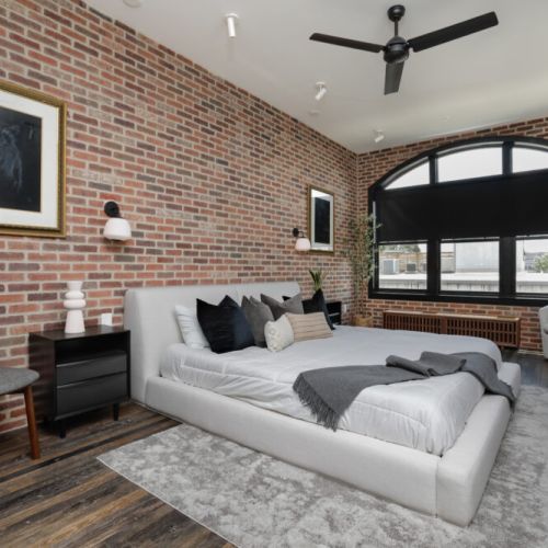 Every detail of this home has been carefully curated, from the open, chef-caliber kitchens with custom Bell Wood cabinets to the Jenn Air professional appliances. The design blends modern elegance with historic loft character, featuring reclaimed flooring finished in Rubio Monocoat, marble and quartz countertops, custom brick and tile accent walls, and bespoke lighting fixtures that create a striking ambiance throughout.