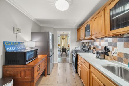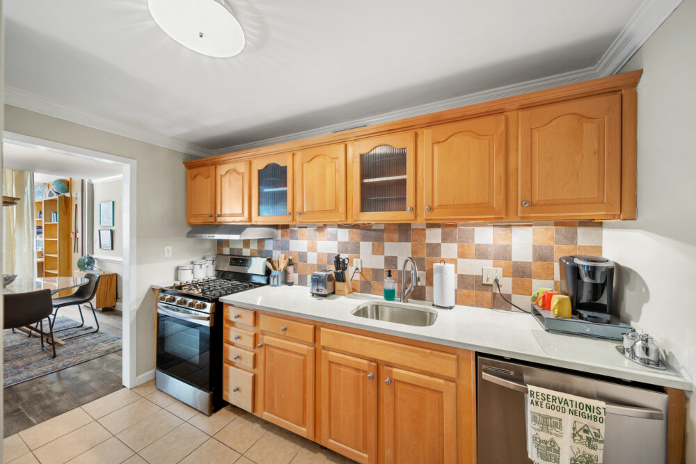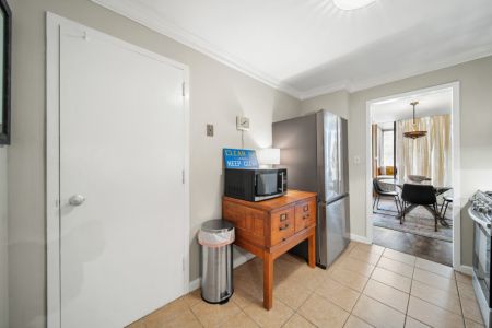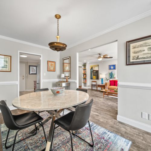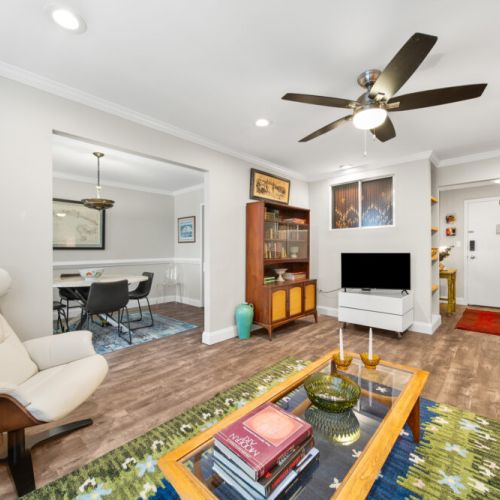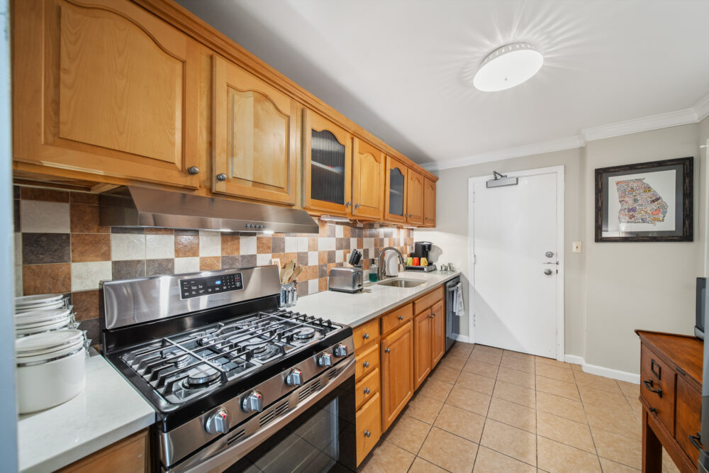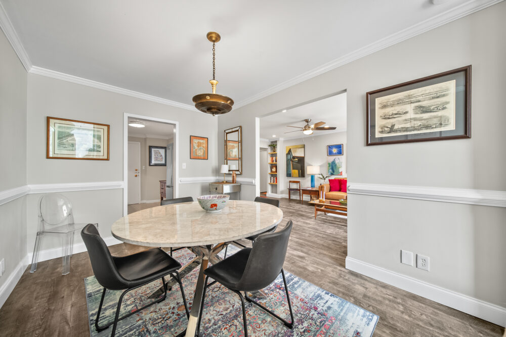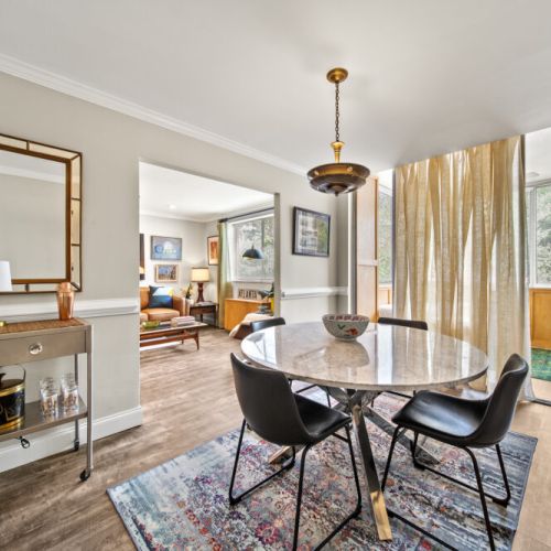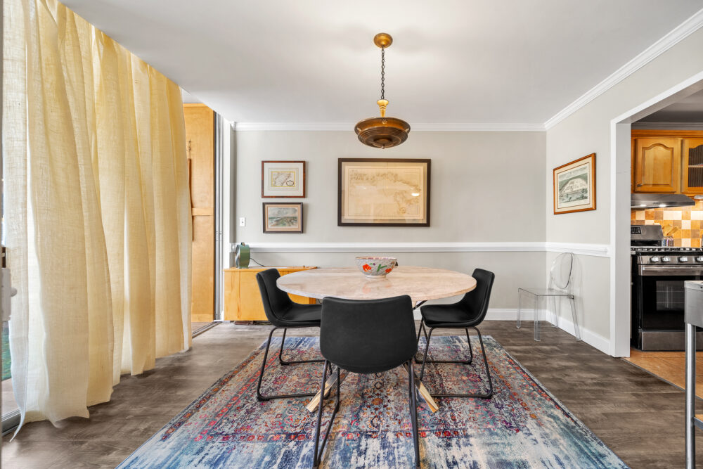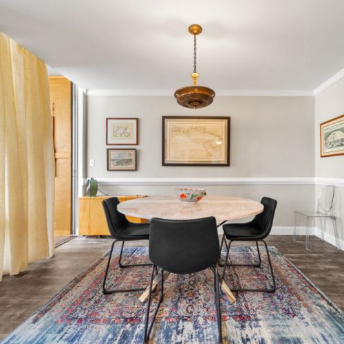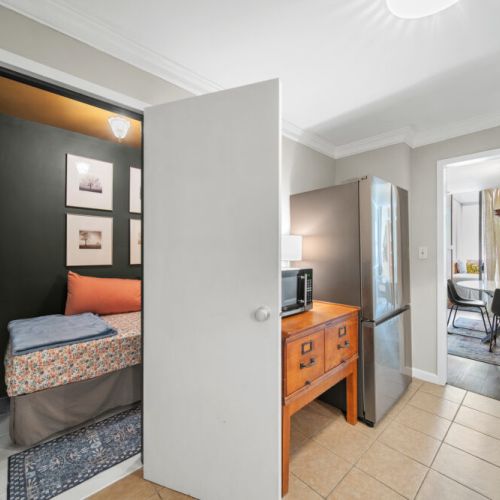 The master bedroom features a queen-size bed, TV, and abundant closet/storage space, with a full bath that retains its original charm while providing all the amenities today’s traveler expects. The primary living area boasts a large dining room and bar with seating for 4 at the marble-topped table, plus a fully equipped kitchen with full-size appliances—perfect for meals, entertaining, or working from home.