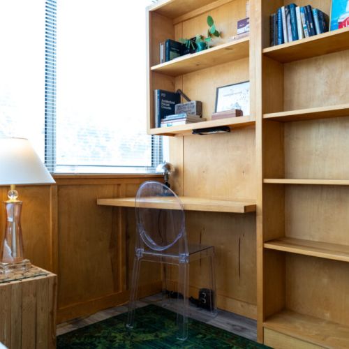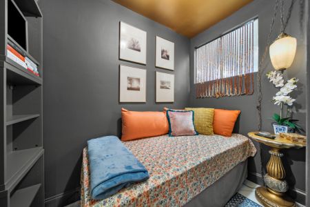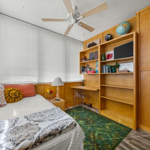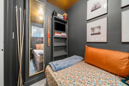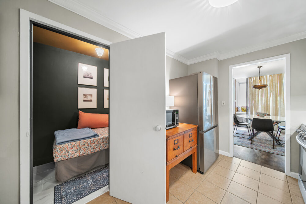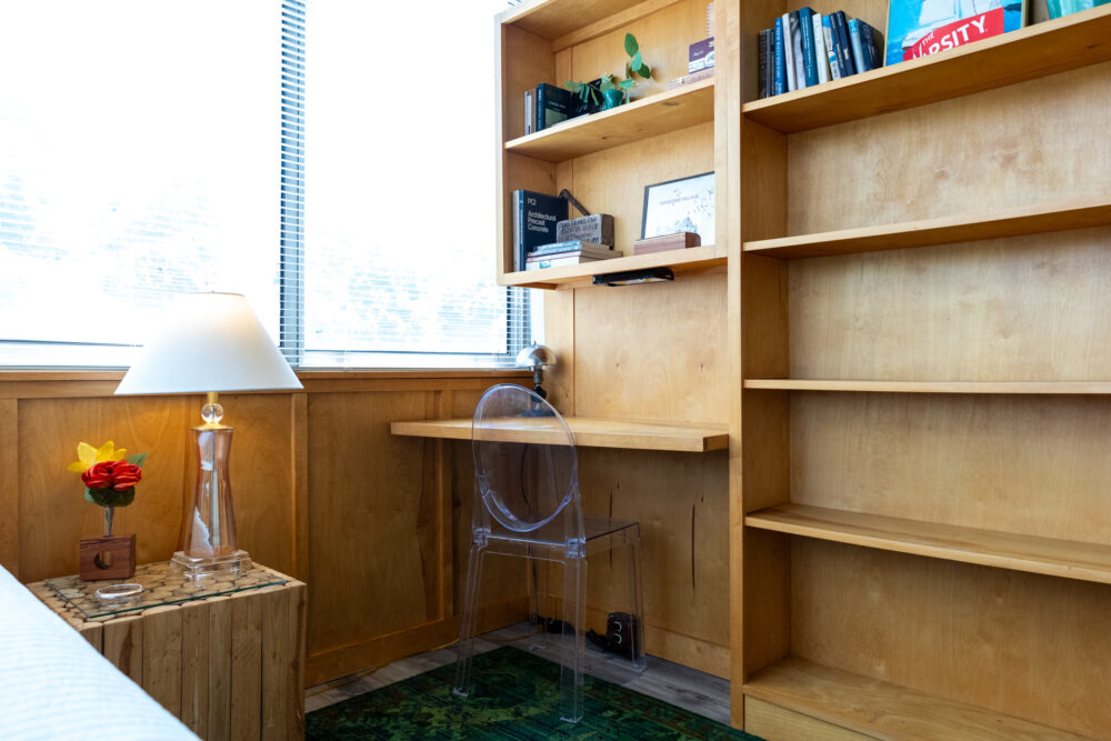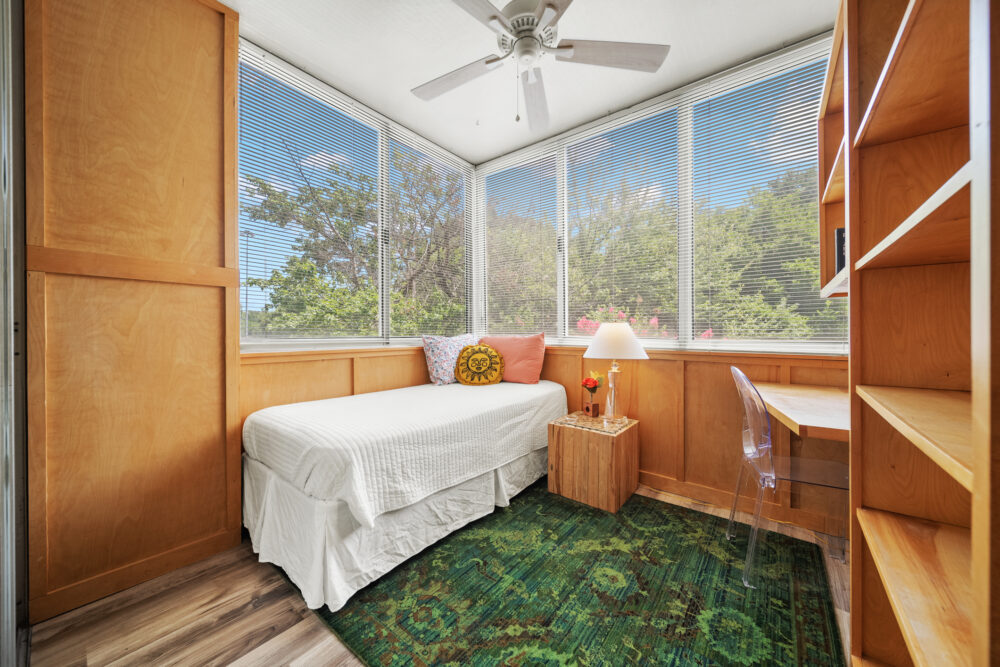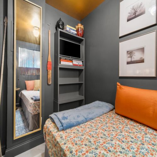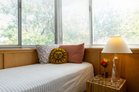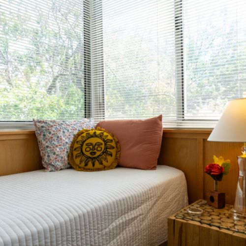 The ‘treehouse’ bedroom is a charming retreat with a single daybed, built-in desk, and stunning pool and tree canopy views—ideal for napping, reading, or work. The Moroccan-inspired ‘destination’ bedroom offers a quiet and private spot to relax, complete with original artwork and period lighting.